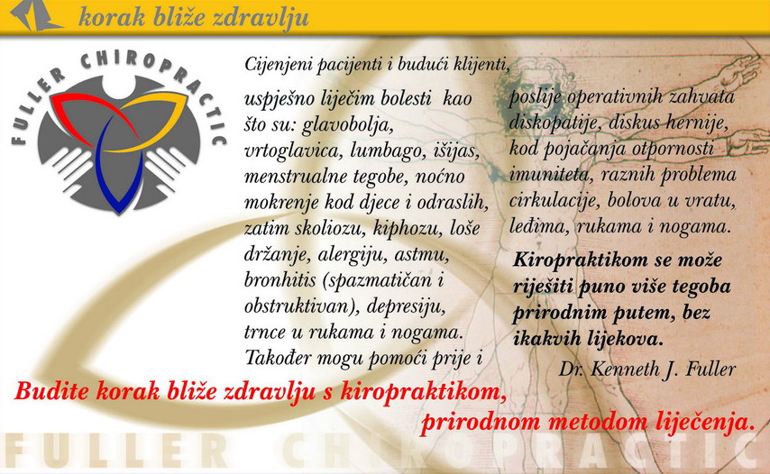 Također se vrlo dobro zna da će liječnik kiropraktičar, ukoliko je to potrebno, preporučiti svom pacijentu liječnika medicine – specijalistu iz područja medicine koji će najbolje pomoći za rješavanje određenog zdravstvenog problema. Ustvari, kiropraktika je ISPRAVAN IZBOR ako želite neagresivno liječenje koje blagotvorno djeluje, a ne iziskuje uzimanje lijekova ili kirurške operativne zahvate.