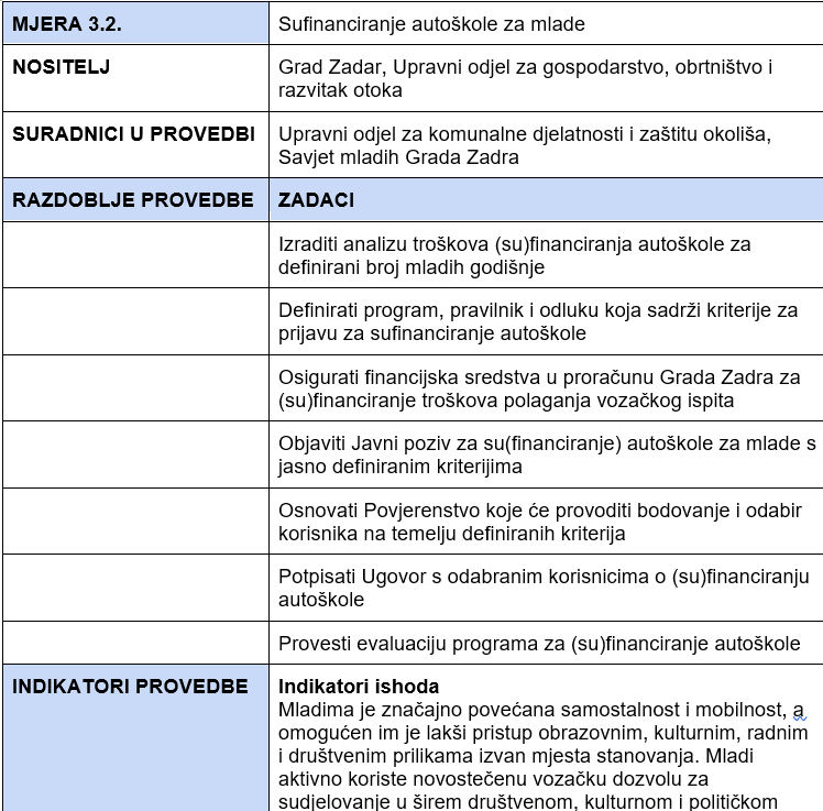 Uz sufinanciranje autoškola, Program predviđa i niz drugih konkretnih mjera. Mladi će moći sudjelovati u radu Savjeta mladih, čime se osigurava njihov utjecaj na donošenje odluka i prioritetizaciju aktivnosti. Volonterstvo će biti poticano kroz financiranje projekata i programa, a u planu su i ulaganja u javne prostore za sport i rekreaciju kao zone za kvalitetno provođenje slobodnog vremena.