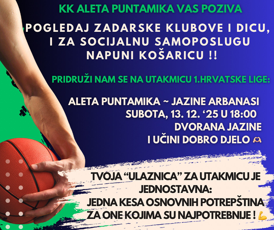 Pridružite se utakmici Prve Hrvatske lige – Aleta Puntamika vs. Jazine Arbanasi u subotu, 13. 12. u 18:00 sati u dvorani Jazine i učinite dobro djelo.