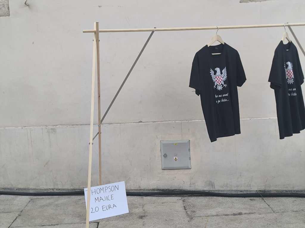 Na improviziranom štandu, postavljenom izravno na javnoj površini ispred ulaza u dvije povijesne palače, izložile su majice za nadolazeće koncerte Marka Perkovića Thompsona.