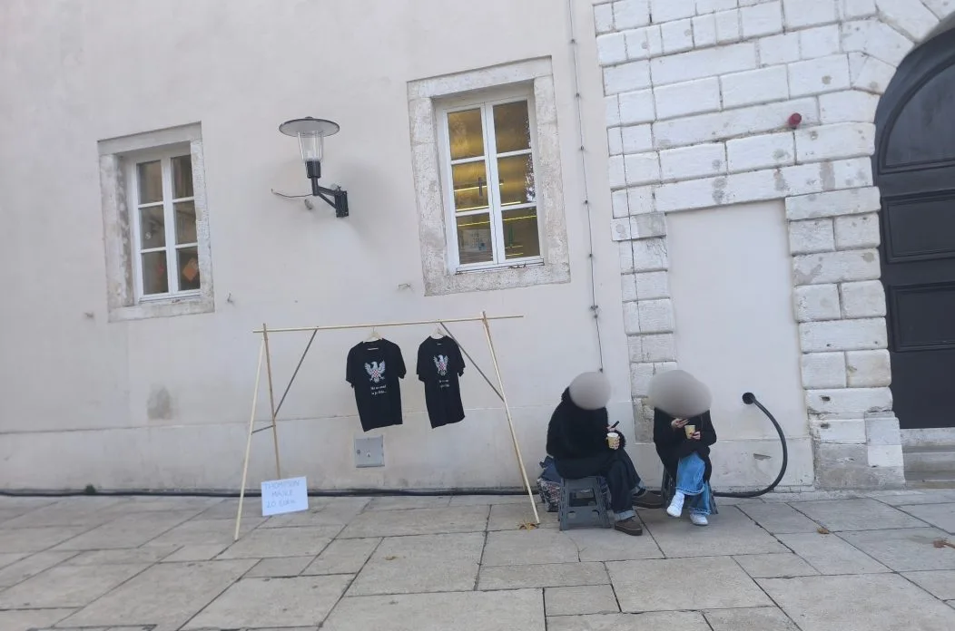 Ponuda je skromna, jedan model, crna boja, cijena 20 eura. Na papiru je rukom ispisana cijena, a ispred njih vise samo dva izložbena primjerka. Pored njih – skladište – kutija puna majica. Bez varijacija u kroju, bez posebnih motiva – čisti minimalistički merch za najvjernije fanove.