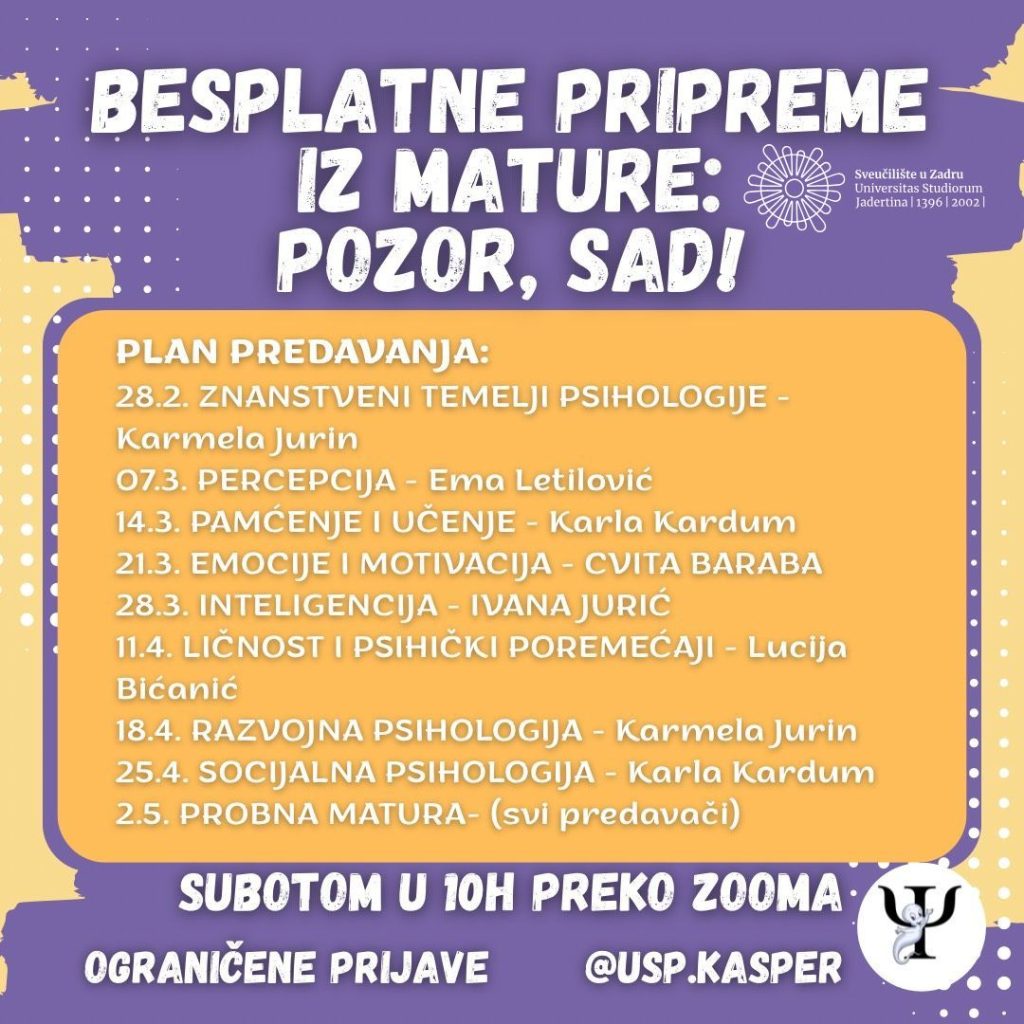 Pripreme za maturu iz psihologije organizira Udruga studenata psihologije Kasper. Planirano je osam predavanja sa zasebnim cjelinama koje se pojavljuju na maturi. Te cjeline su: znanstveni temelji psihologije, percepcija, pamćenje i učenje, emocije i motivacija, inteligencija, ličnost i psihički poremećaji, razvojna psihologija te socijalna psihologija. Datumi, predavači i teme predavanja objavljeni su na Instagram profilu (udruga@usp.kasper).