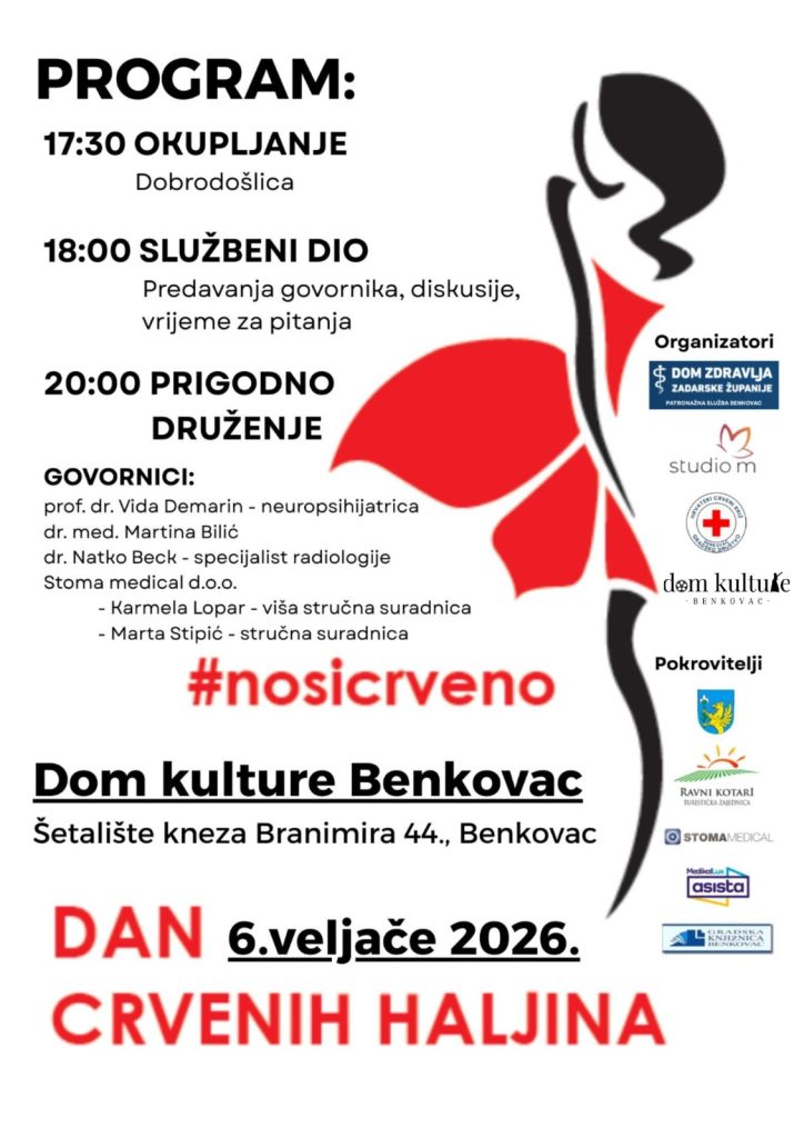 U organizaciji Doma zdravlja Zadarske županije – Službe patronažne zdravstvene zaštite – radna jedinica Benkovac, STUDIA M Benkovac, Doma kulture Benkovac i Crvenog križa Benkovac te uz pokroviteljstvo Grada Benkovca, Turističke zajednice Ravni kotari, Gradske knjižnice Benkovac, Stoma medical i Medikal Lux Asista održat će se obilježavanje Dana crvenih haljina.