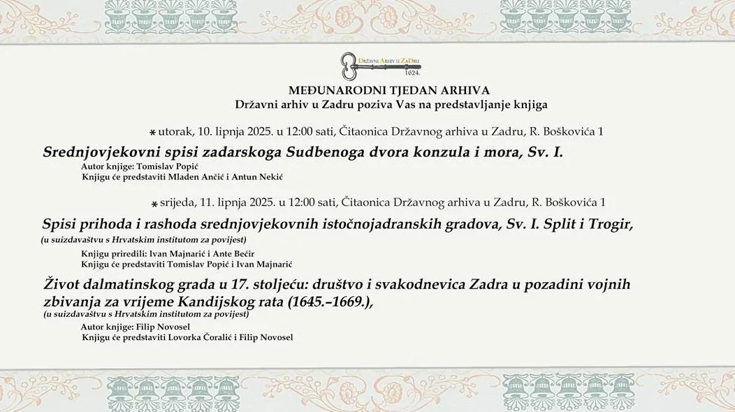 Sutradan, u srijedu 11. lipnja, u 12,00 sati priredit će se predstavljanje dvije knjige koje je Državni arhiv u Zadru priredio u sunakladništvu s Hrvatskim institutom za povijest.