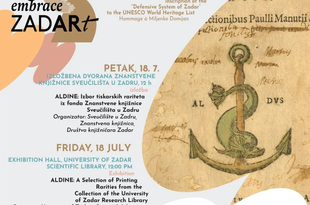 Znanstvena knjižnica Sveučilišta u Zadru povodom 170. obljetnice djelovanja Knjižnice, a u sklopu manifestacije „Zagrli Zadar“ u organizaciji Grada Zadra te s Društvom knjižničara Zadar priređuje izložbu pod nazivom „Aldine: izbor tiskarskih rariteta iz fonda Znanstvene knjižnice Sveučilišta u Zadru.“