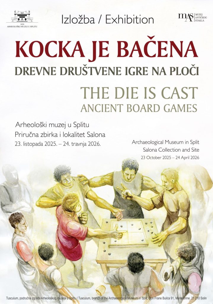 Muzej antičkog stakla u Zadru s izuzetnim zadovoljstvom najavljuje četvrto međumuzejsko gostovanje izložbe „Kocka je bačena: drevne društvene igre na ploči“ koja će se otvoriti u četvrtak, 23. listopada 2025. u 12,00 sati u Priručnoj zbirci i lokalitetu Salona.