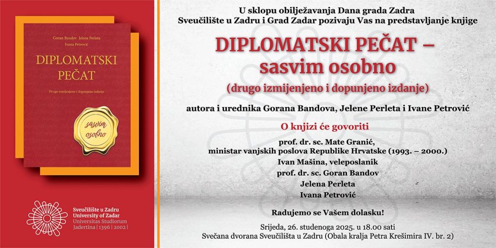 U okviru obilježavanja Dana grada Zadra, Sveučilište u Zadru i Grad Zadar pozivaju na predstavljanje knjige Diplomatski pečat – sasvim osobno (drugo izmijenjeno i dopunjeno izdanje) autora i urednika Gorana Bandova, Jelene Perleta i Ivane Petrović.