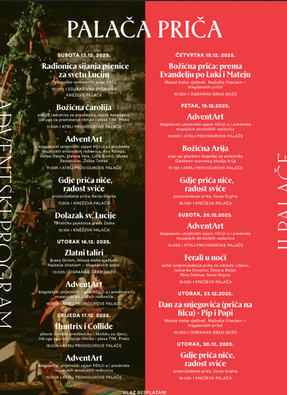 U blagdanskom ozračju Providurove i Kneževe palače – tzv. II Palače tijekom prosinca održava se bogat i raznolik program za djecu, mlade i odrasle. Posjetitelje očekuju kreativne radionice, plesne izvedbe, umjetnički sajam AdventArt te brojna pripovijedanja koja donose duh tradicije i bajkovitih priča.