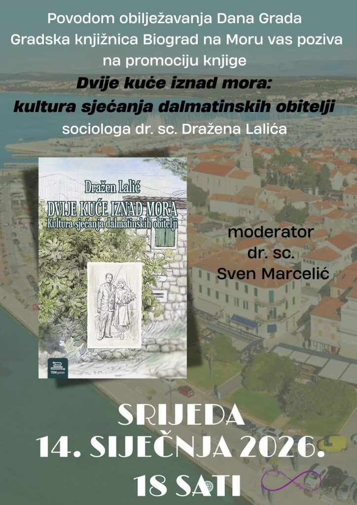 Povodom obilježavanja Dana Grada pozivamo vas na promociju knjige “Dvije kuće iznad mora: kultura sjećanja dalmatinskih obitelji”, dr. sc. Dražena Lalića, profesora na Fakultetu političkih znanosti u Zagrebu i jednog od poznatijih sociologa u zemlji.
