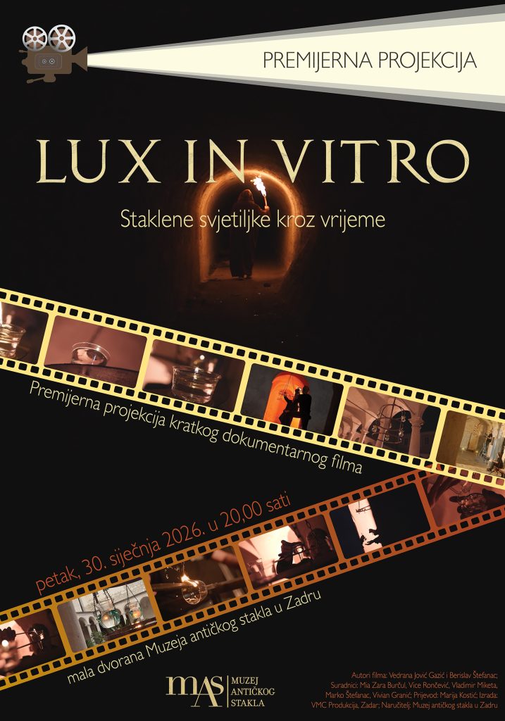 Muzej antičkog stakla u Zadru najavljuje premijerno prikazivanje kratkog dokumentarnog filma „LUX IN VITRO – Staklene svjetiljke kroz vrijeme“, koje će se održati u petak, 30. siječnja 2026. u 20:00 sati u sklopu ovogodišnjeg izdanja manifestacije Noć muzeja.