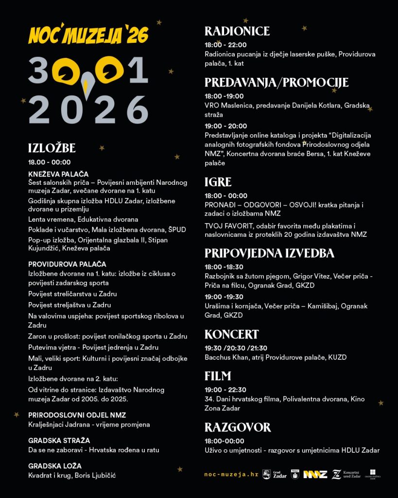 Narodni muzej Zadar objavio je danas i detaljan program za Noć muzeja 2026. koja će se održati u petak, 30.svibnja od 18 do 1 sat