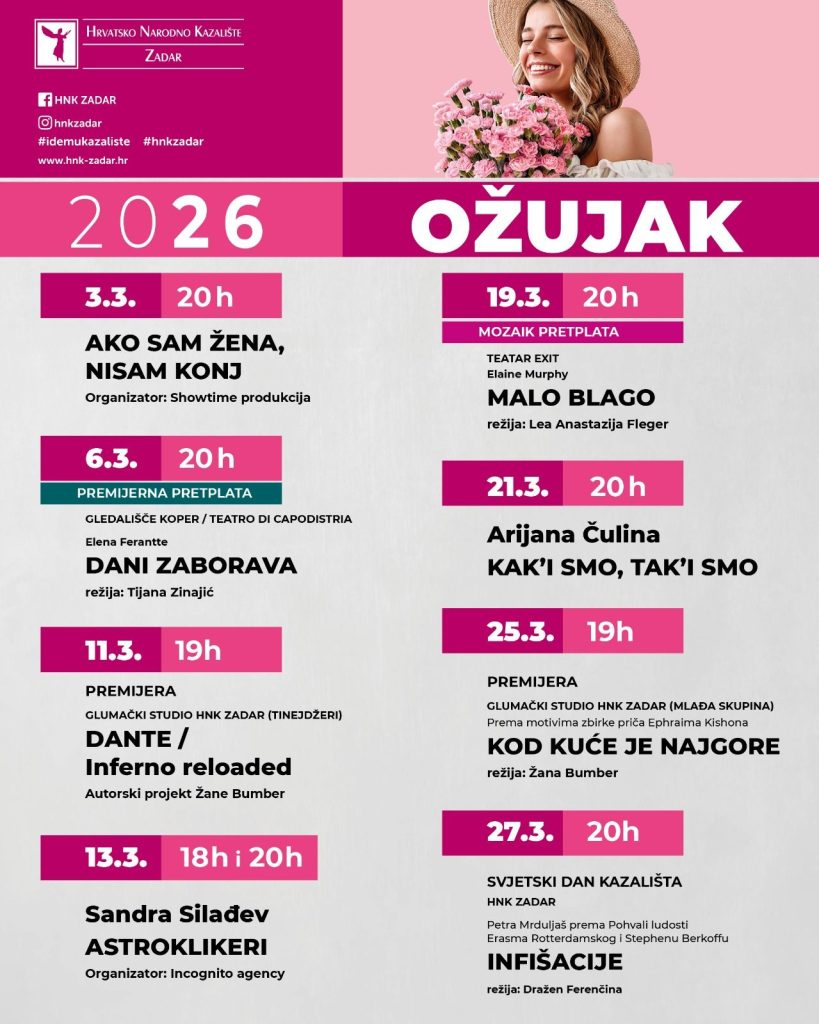 Mjesec ožujak u HNK Zadar započinje predstavom Ako sam žena, nisam konj, koja je na rasporedu 3. ožujka u 20 sati, dok je 6. ožujka u istom terminu na rasporedu predstava Dani zaborava.