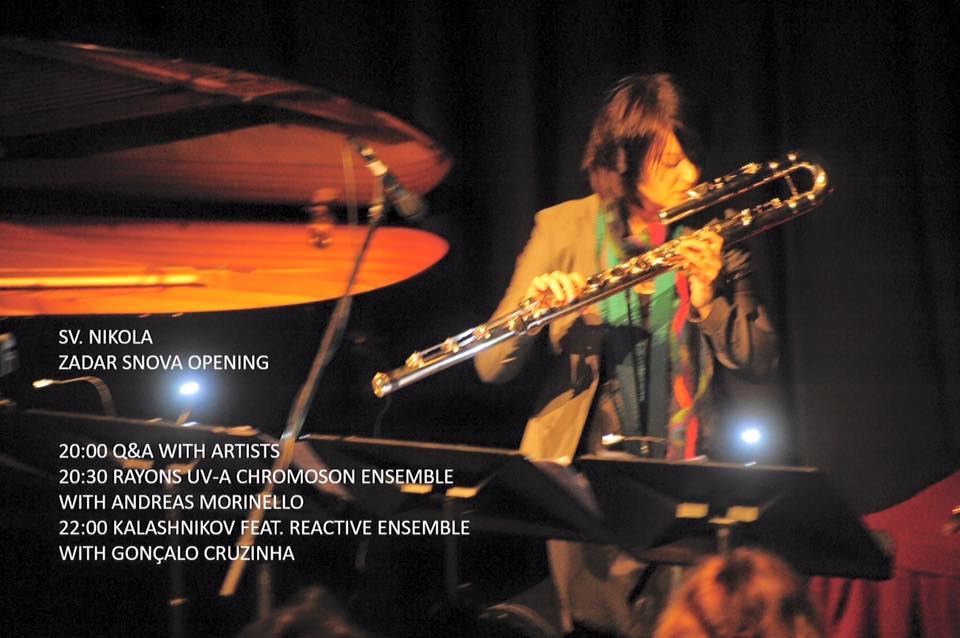 U 20:30 očekuju vas atmosferične, eksperimentalne jazz improvizacije obogaćene elektronikom i svjetlosnim efektimaRayons UV ChromosonEnsemblea s posebnim gostom Andreas Morinellom,solistom i dirigentom HRT Jazz orkestra.