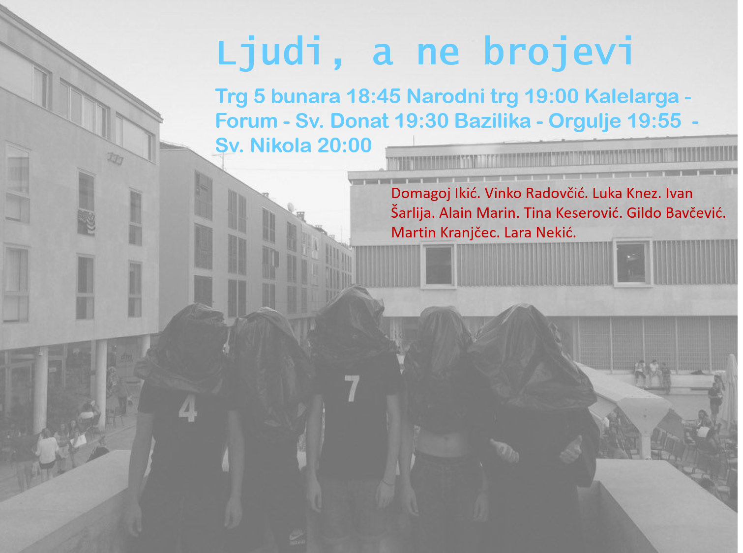 U 18:45 danas započinje Zadar snova s preformansom Ljudi, a ne brojevi. Preispitujući poziciju u društvu skupina mladih je sastavila izvedbenu šetnju kroz Poluotok. Izabrali su mjesto i na njemu umjetnički opisali svoj odnos prema svom gradu. Nakon prologa na Trgu pet bunara obilaze Palminu kraj sv. Šime i počinjemo u 19 sati na Narodnom trgu. Preko Kalelarge idu do Foruma gdje će se pod vodstvom Tine Keserović održati građanski zbor pjesme Zadarska, domaćeg pisca Želimira Periša, poetski ep koji doku-stilom pretresa ‘predpovijest’ opisujući sadašnjost ‘u slobodi’.