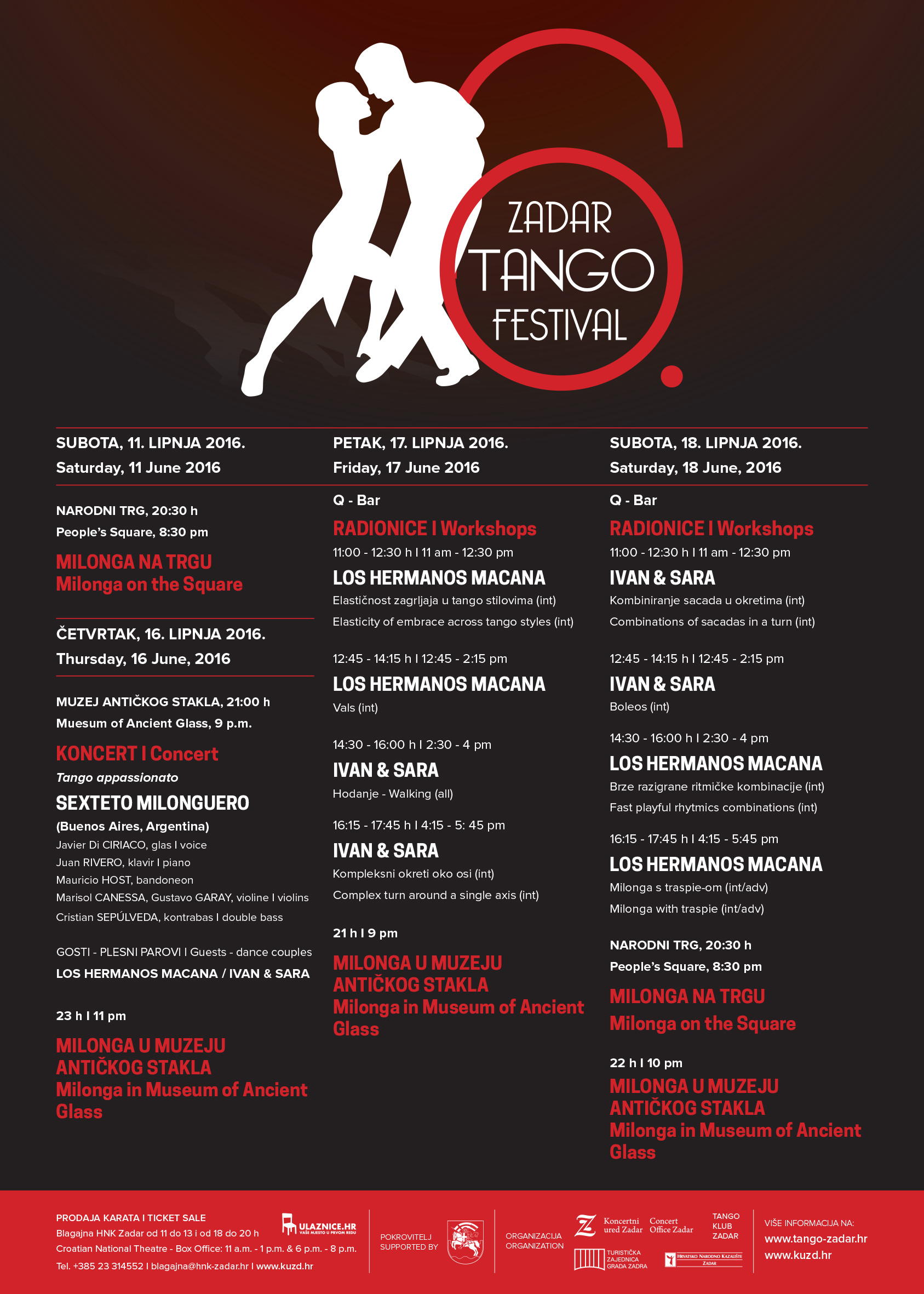U Zadru će se od 16. do 18. ovog mjeseca održati 6. Zadar Tango Festival, ove godine u koprodukciji Tango kluba Zadar i Koncertnog ureda Zadar uz potporu Grada Zadra, Turističke zajednice Grada Zadra i HNK Zadar.