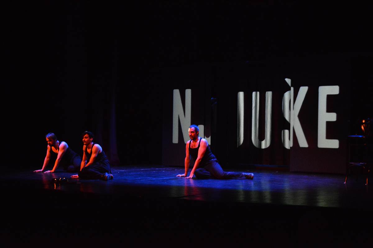 “Njuške” su predstava rađena prema predlošku “The Dog Logs” australskog dramatičara C. J. Johnsona koji je preveden i adaptiran na hrvatski jezik. U njoj glume samo tri glumca: Enes Vejzović, Filip Križan i Janko Rakoš, i svaki od njih glumi nekoliko različitih psećih pasmina. Vrlo skormna i ogoljena scena – samo jedna stolica u uglu te video platno u pozadini, naglasila je ono najvažnije: troje glumaca/pasa i njihova verbalna i fizička utjelovljenja različitih psećih pasmina i životnih monologa.