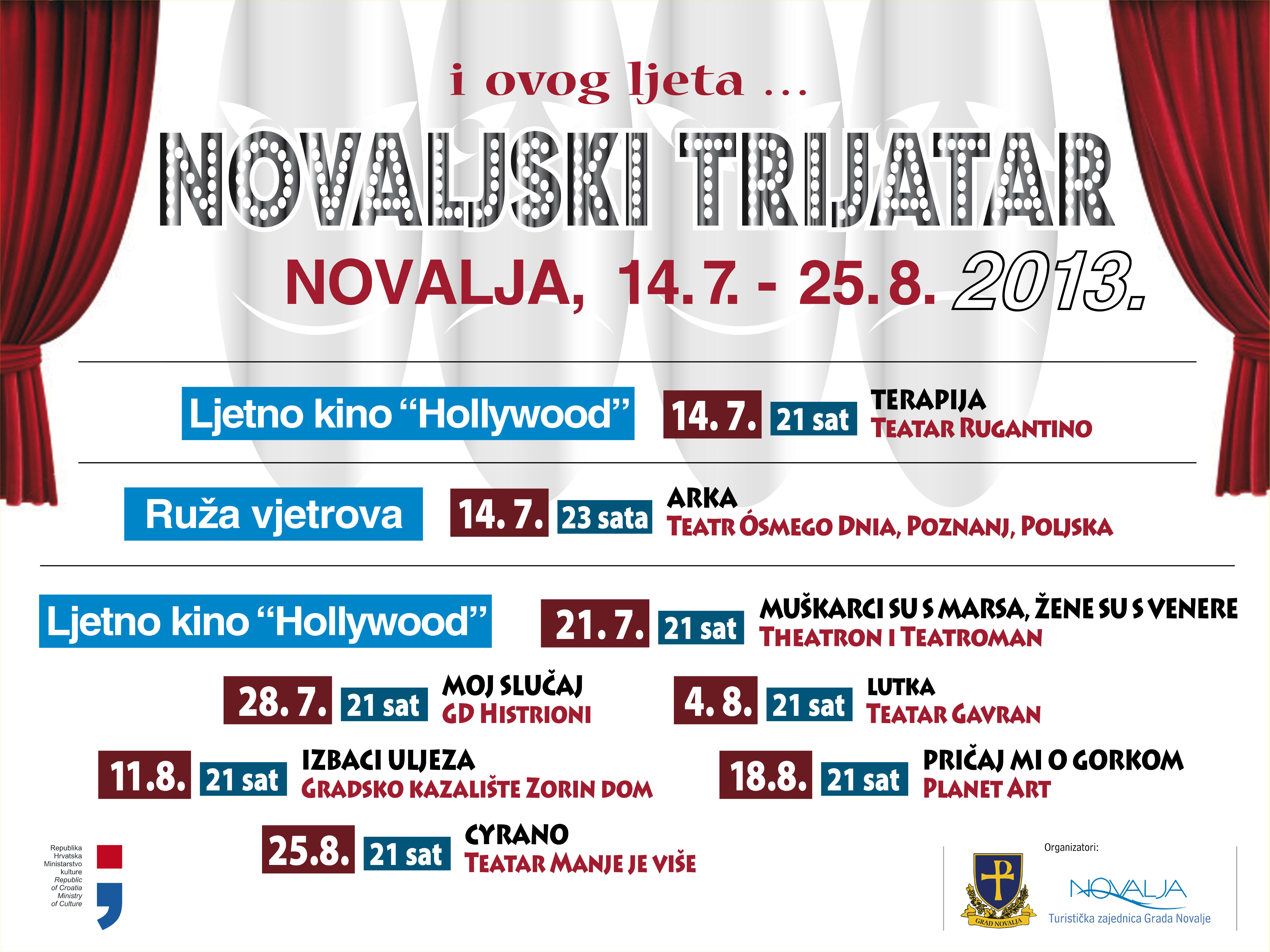 Novaljci i njihovi gosti moći uživati u predstavi Terapija Teatra Rugantino, te spektakularnoj predstavi Arka poljske kazališne trupe Teatr Ósmego Dnia (Kazališta osmoga dana) iz Poznanja koja će biti izvedena na Ruži vjetrova.”Nakon šest uspješno odigranih i još bolje odgledanih sezona Novaljskog trijatra, na početku sedmog ljeta imamo pravo govoriti o kazališnom festivalu koji postaje tradicionalan.