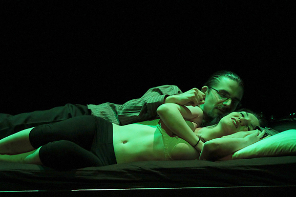A kad je riječ o Adamu, on je taj koji upravlja, djeluje samouvjereno, veliki egomanijak koji se nastoji agresivno nametnuti svojoj družici na pozornici.