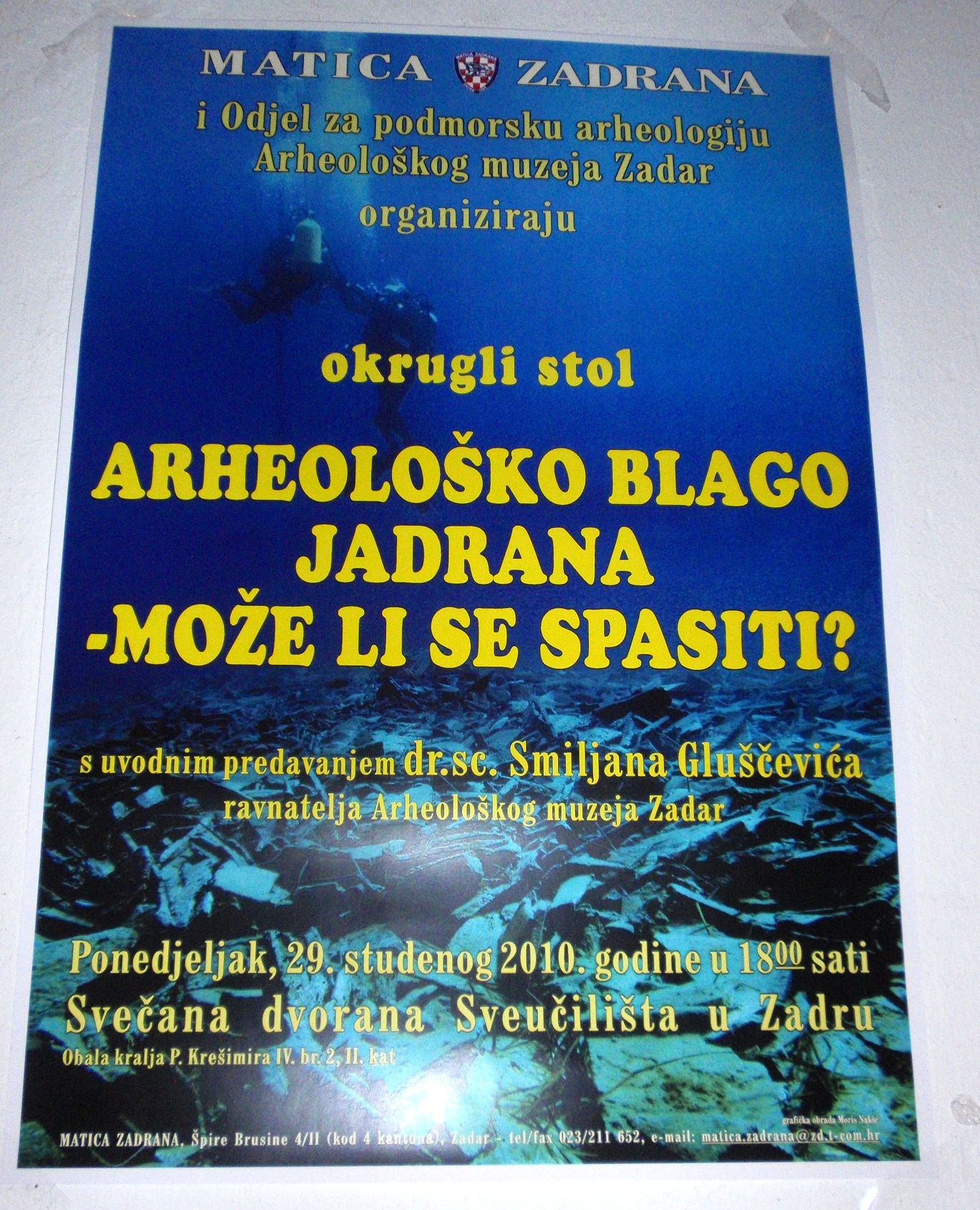 Jučer navečer se u Svečanoj Dvorani Sveučilišta održao Okrugli stol pod nazivom ‘Arheološko blago Jadrana – Može li se spasiti?’, koju su organizirali Matica Zadrana i Odjel za podmorsku arheologiju Arheološkog muzeja u Zadru.