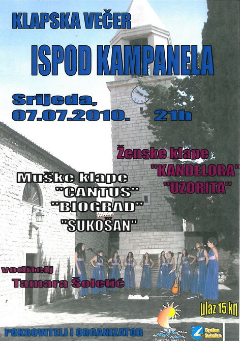 Nastupiti će ženske klape ” Kandelora” – Zemunik i “Uzorita” – Sukošan, te muške klape: “Cantus” Sv.Filip i Jakov, “Biograd” i “Sukošan”, a voditeljica večeri je Tamara Šoletić.