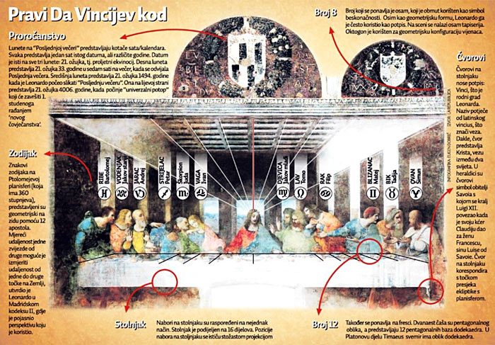 – Najveća prijevara Dana Browna je da priča o kodu, a ne nudi ključeve za njegovo dekodiranje. Međutim, u Leonardovim slikama uistinu postoji mehanizam dekodiranja. To su znaci koji predstavljaju 24 sata u danu, a svaki od njih korespondira s jednim slovom latinske abecede – rekla je Sforza Galitzia. Ona je ustvrdila da je Leonardo u stvaranju “Posljednje večere” koristio matematičke, geometrijske i astrološke simbole kako bi predstavio univerzum kao “kozmički sat”, kronometar koji se dijeli na epohe. Svaki dio slavne Leonardove freske krije svoju simboliku, no najvažnije je proročanstvo koje je razabrala Sforza Galitzia. Ona je otkrila da se na sve tri polukružne lunete krije isti datum, 21. ožujka, datum proljetnog ekvinocija.