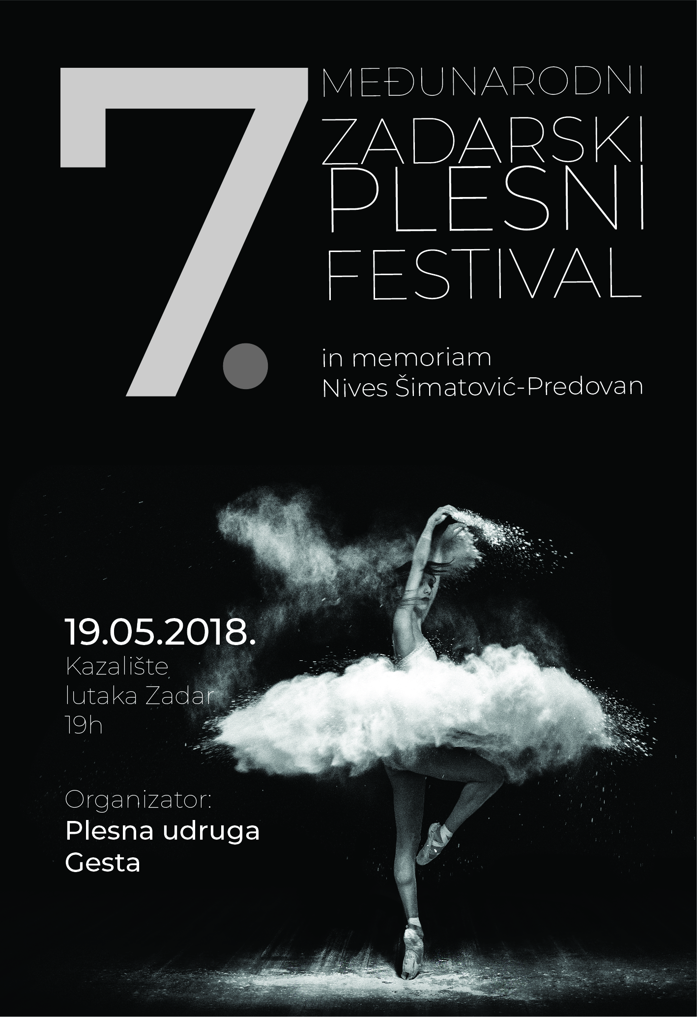 7. Međunarodni zadarski plesni festival, in memoriam Nives Šimatović-Predovan, organira plesna udruga Gesta, a održat će se u subotu 19. svibnja u Kazalištu lutaka Zadar s početkom u 19 sati. Ulaznice se mogu kupiti na blagajni KLZ.
