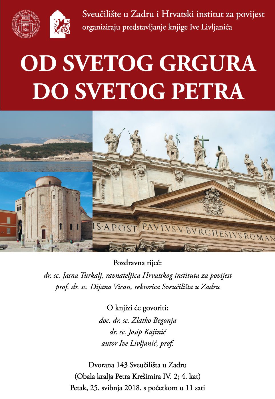 Sveučilište u Zadru i Hrvatski institut za povijest pozivaju na predstavljanje knjige Ive Livljanića pod nazivom "Od svetog Grgura do svetog Petra" koje će se održati u dvorani 143 (Obala kralja Petra Krešimira IV. 2; 4. kat) u petak, 25. svibnja.