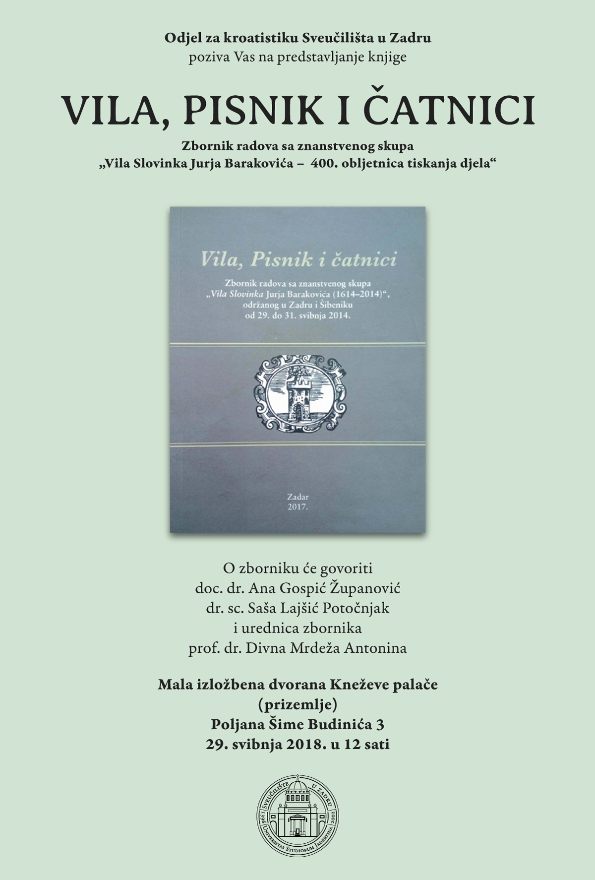 Odjel za kroatistiku Sveučilišta u Zadru poziva na predstavljanje knjige "Vila, Pisnik i čatnici" - Zbornik radova sa znanstvenog skupa "Vila Slovinka Jurja Barakovića - 400. obljetnica tiskanja djela.