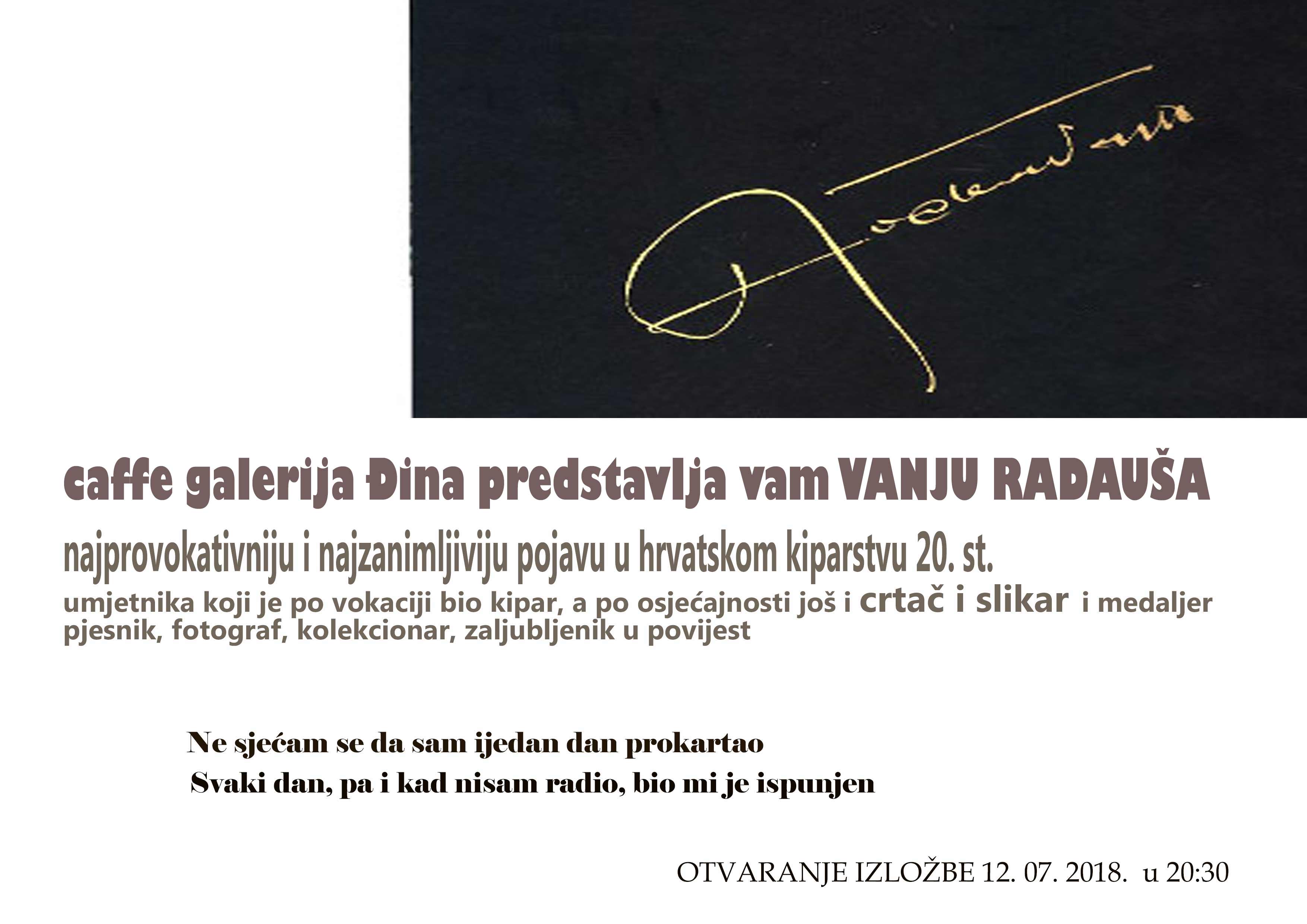 Caffe galerije Đina organizira izložbu Vanje Radauša. Otvorenje je u četvrtak, 12. srpnja u 20:30 sati.