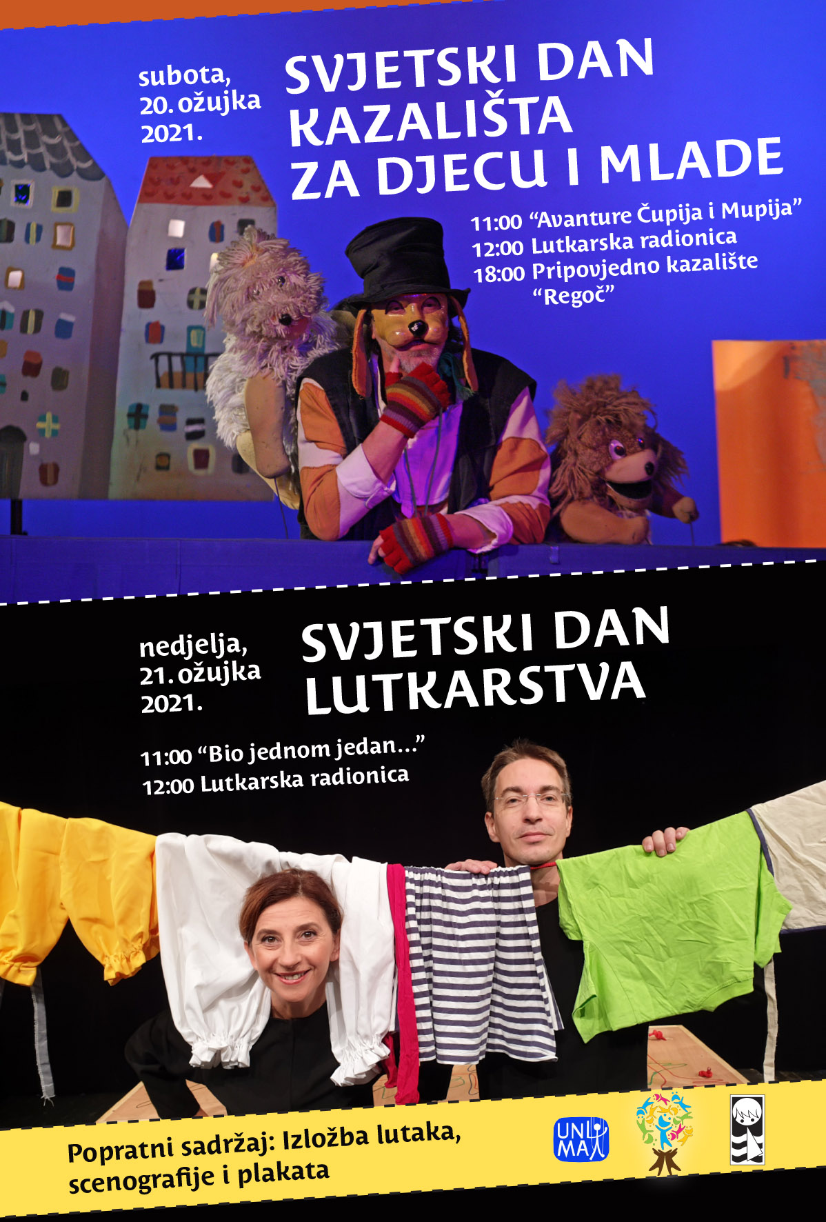 Program obilježavanja započinje u subotu, 20. ožujka u 11 sati predstavom “Avanture Čupija i Mupija” u režiji Roberta Raponje. Nakon predstave maleni posjetitelji će moći ostati na tematiziranoj lutkarskoj radionici i izraditi svoje lutkice na temu odgledane predstave. U 18 sati očekuje vas pripovjedna predstava “Regoč”. Ulaz na predstavu je slobodan uz obaveznu rezervaciju.