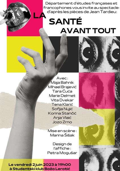 U petak 2. lipnja 2023. u 19 sati u Studentskom klubu “Božo Lerotić” studenti i zaposlenici Odjela za francuske i frankofonske studije izvest će predstavu “La santé avant tout” (prema dramama Jeana Tardieua).