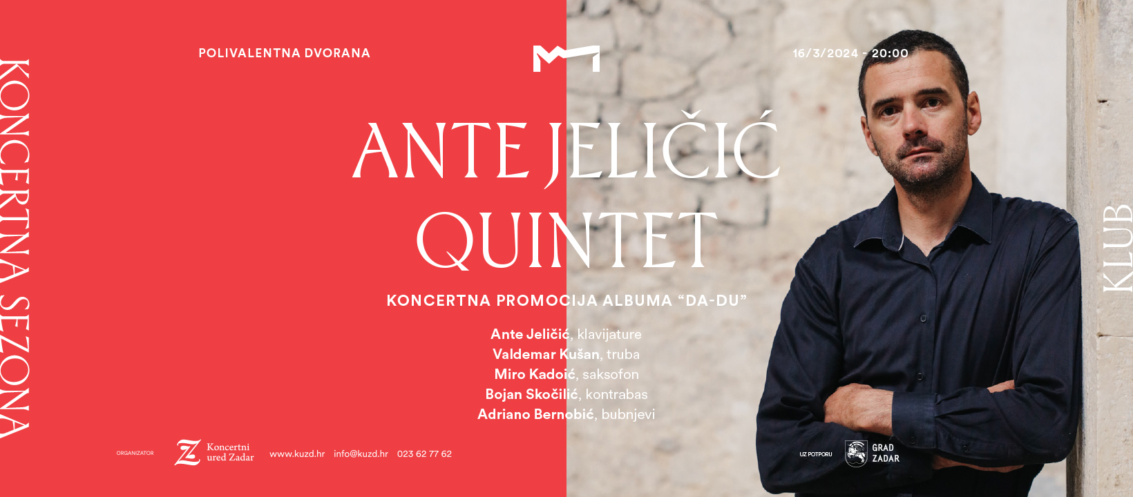 Talentirani biogradski jazz pijanist Ante Jeličić zajedno sa svojim kvintetom po prvi put će predstaviti svoj novi album Da-Du, upravo u Zadru, koncertom u Polivalentnoj dvorani Providurove palače, u subotu, 16. ožujka u 20 sati.