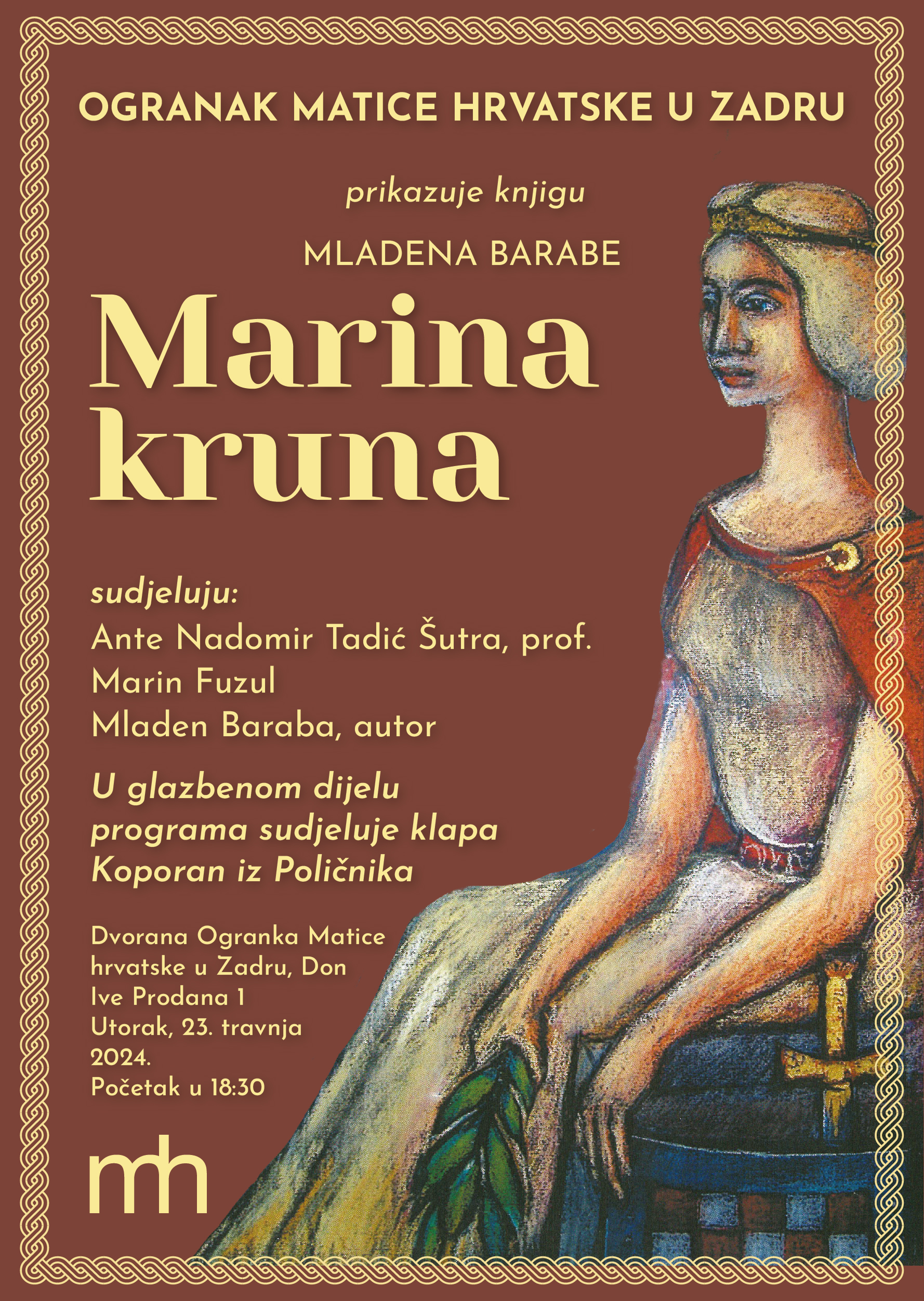 Ogranak Matice hrvatske u Zadru predstavlja knjigu Mladena Barabe Cvitića: Marina kruna. Predstavljanje će se održati u dvorani Ogranka Matice hrvatske u Zadru, na adresi Don Ive Prodana 1, u utorak 23. travnja s početkom u 18:30.