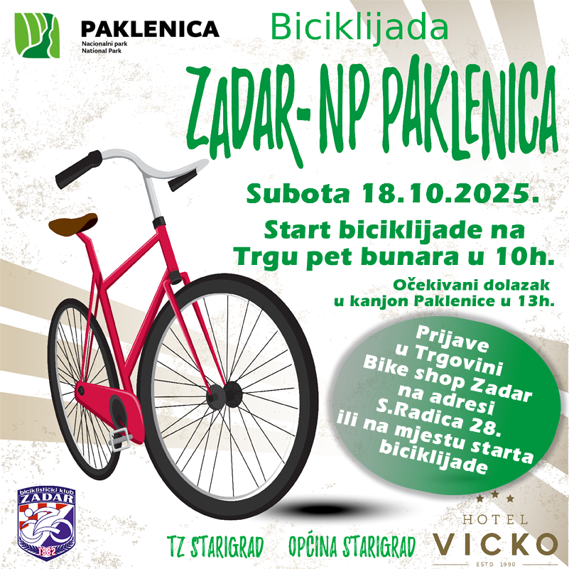 Biciklijada Zadar-Paklenica će se održati 18. listopada 2025. godine sa startom na Trgu 5 bunara u 10 sati. Prijave za sudjelovanje primaju se radnim danom od 8 ujutro do 20 sati u Bike-shopu Zadar na adresi Stjepana Radića 28.