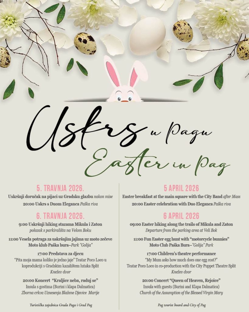 Turistička zajednica Grada Paga i Grad Pag organiziraju prigodni blagdanski program „Uskrs u Pagu”, koji donosi raznovrsna događanja – od tradicionalnih običaja i glazbenih nastupa do aktivnosti na otvorenom i sadržaja za djecu.