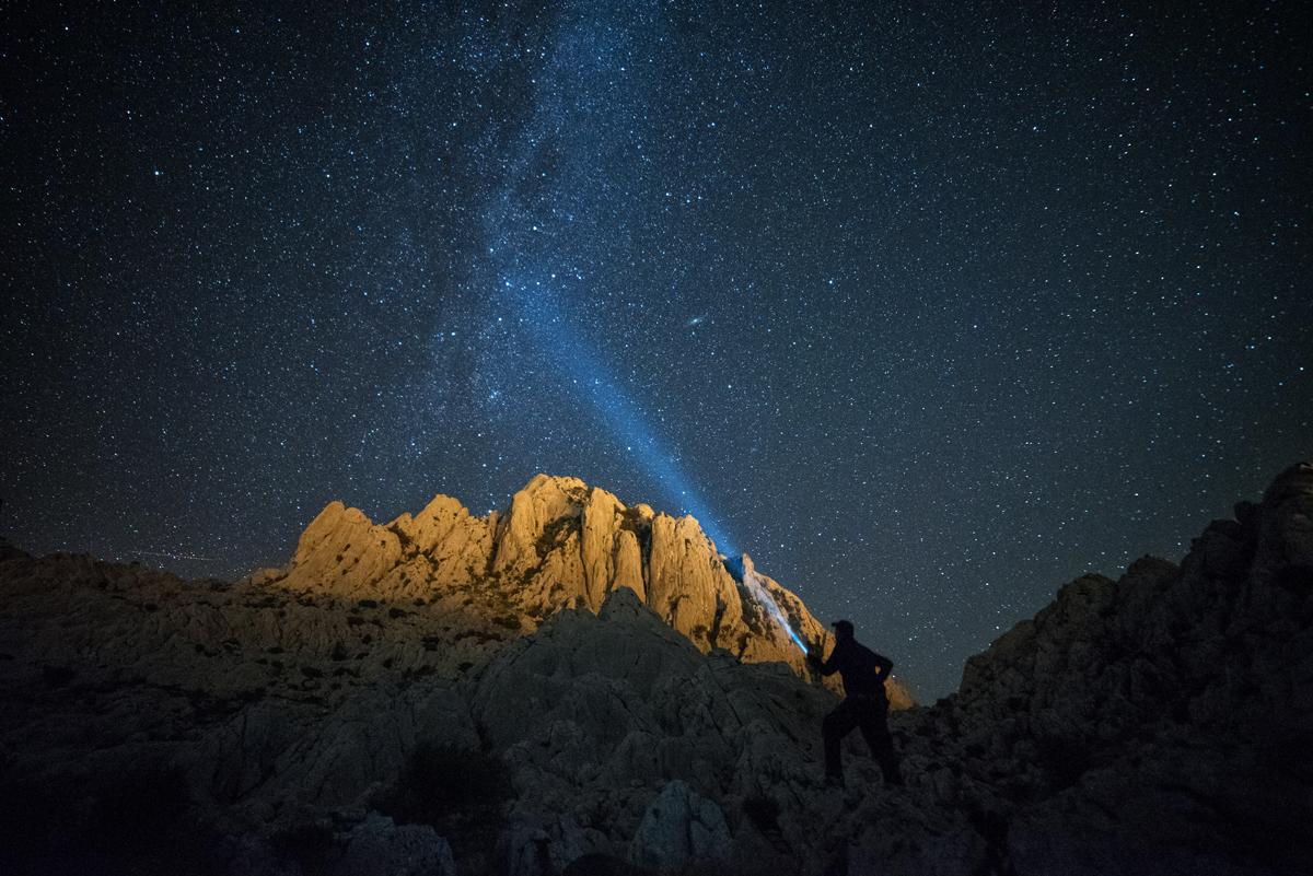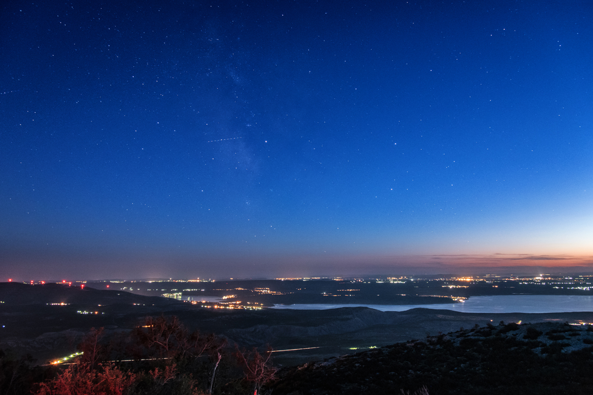Kristalno nebo s bezbrojnim zvijezdama, Andromedina galaksija, Mliječni put ponad Tulovih greda, čiji su vrhovi dodatno osvijetljeni svjetlima Ravnih kotara, prizor je koji ostavlja bez daha.