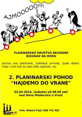 Planinarsko društvo Belveder iz Biograda na Moru poziva sve planinare, ljubitelje prirode, ljude dobre volje i one koji se tako žele osjećati na 2. planinarski pohod “HAJDEMO DO VRANE”.