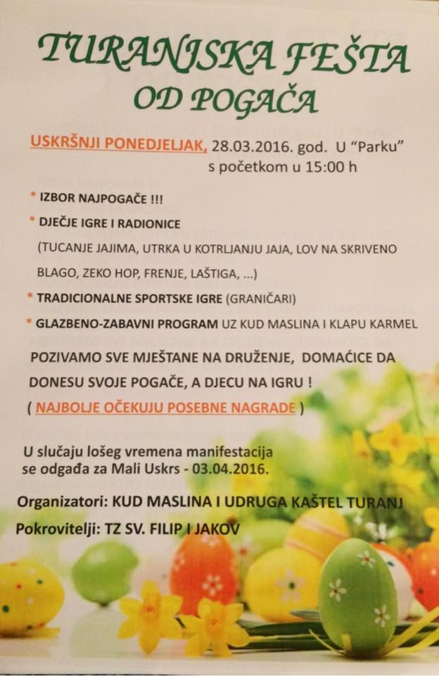 Najavljujemo prvu Turanjsku feštu od pogača koja će se održati 28. ožujka 2016 godine u “Parku”, Turanj u organizaciji KUD-a Maslina i Udruge Kaštel, a pod pokroviteljstvom Turističke zajednice općine Sv. Filip i Jakov.