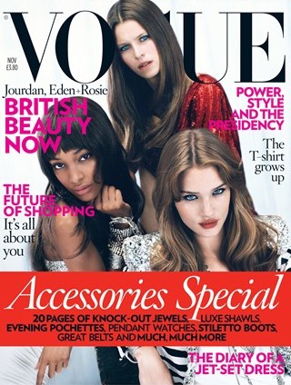 Podsjećamo, Jourdan je za naslovnicu britanskog Voguea (studeni 2008.) pred objektivom Emme Summerton pozirala zajedno s Rosie Huntington i Eden Clark.