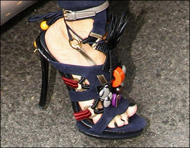 Ipak, zamijećene su Louis Vuitton sandale, potpetice visoke trinaest centimetara, prekrivene šarenim gumbima.
