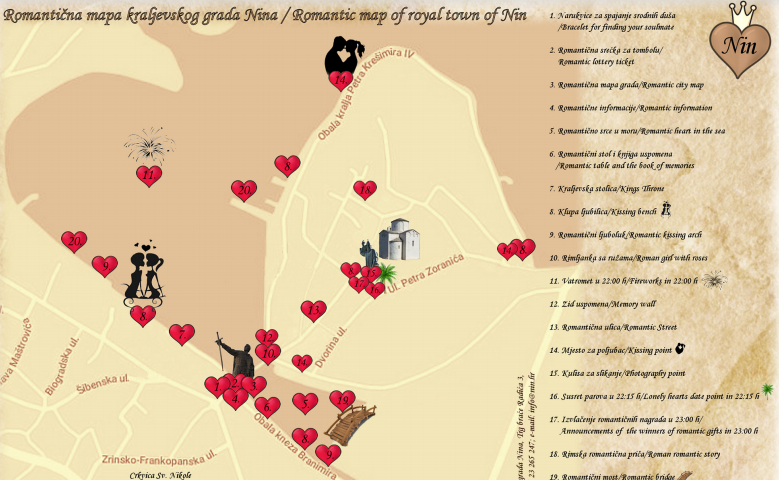 Dođite u Nin na Festival romantike – Romantičnu noć i provozajte se ninskim drvenim brodom, slikajte se ispod ljuboluka, pronađite označena kiss point mjesta, upišite vaše uspomene i misli na memory wall, uživajte u živoj glazbi na više mjesta u gradu, a kad se umorite sjedite na jednu od naših klupa ljubilica, kupite ružu kod Rimljanke, te otkrijte još mnogo toga što kriju ulice ovog romantičnog povijesnog grada.