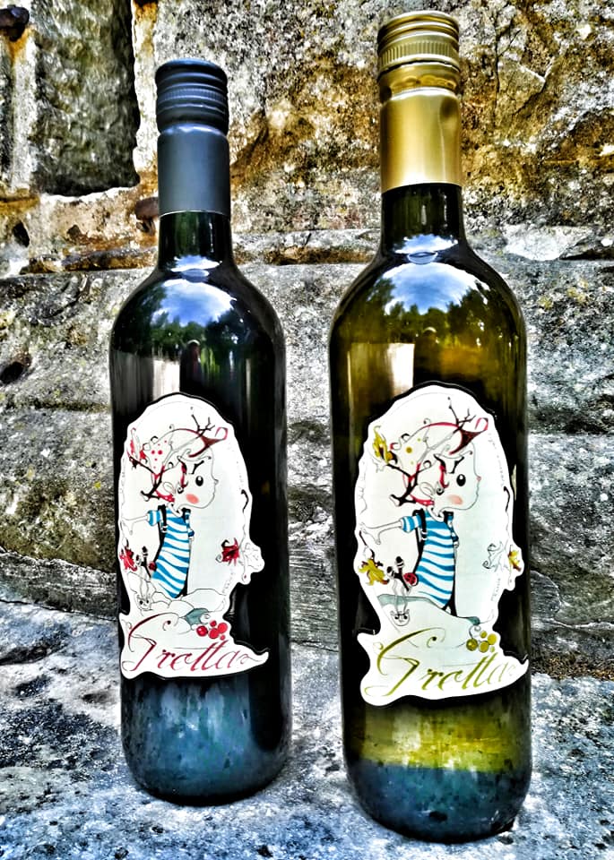 Suhi merlot dobio je novu dimenziju – spomenimo i sam naziv grota, te je na na jednim bocama kamen, grota, a na drugima suhozid, mocira. Bijelo i crno. U dvije verzije nastala je poveznica mladog vina, djeteta, rađanja novog života.
