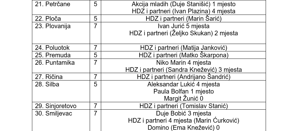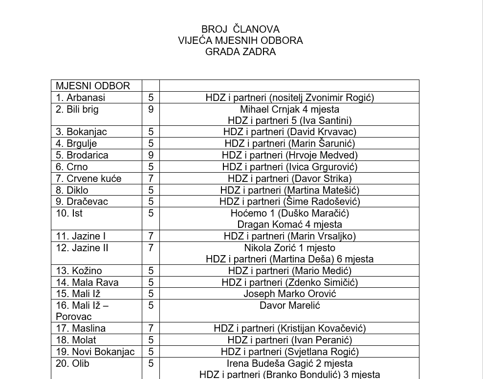 Na Smiljevcu je HDZ osvojio većinu s 4 mjesta, a nezavisni Duje Bobić dobio je 3 mjesta. U vijeću Petračana će sjediti 4 iz HDZ-a i partnera te Duje Stanišić iz Akcije mladih. Na Olibu je HDZ dobio 3 mjesta, a Irena 2 mjesta. U MO Jatine II HDZ je odnio 6 mjesta, a Nikola Zorić 1 mjesto. HDZ također s većinom na Bilom brigu gdje je osvojio 5 mjesta, a Mihael Crnjak 4 mjesta.