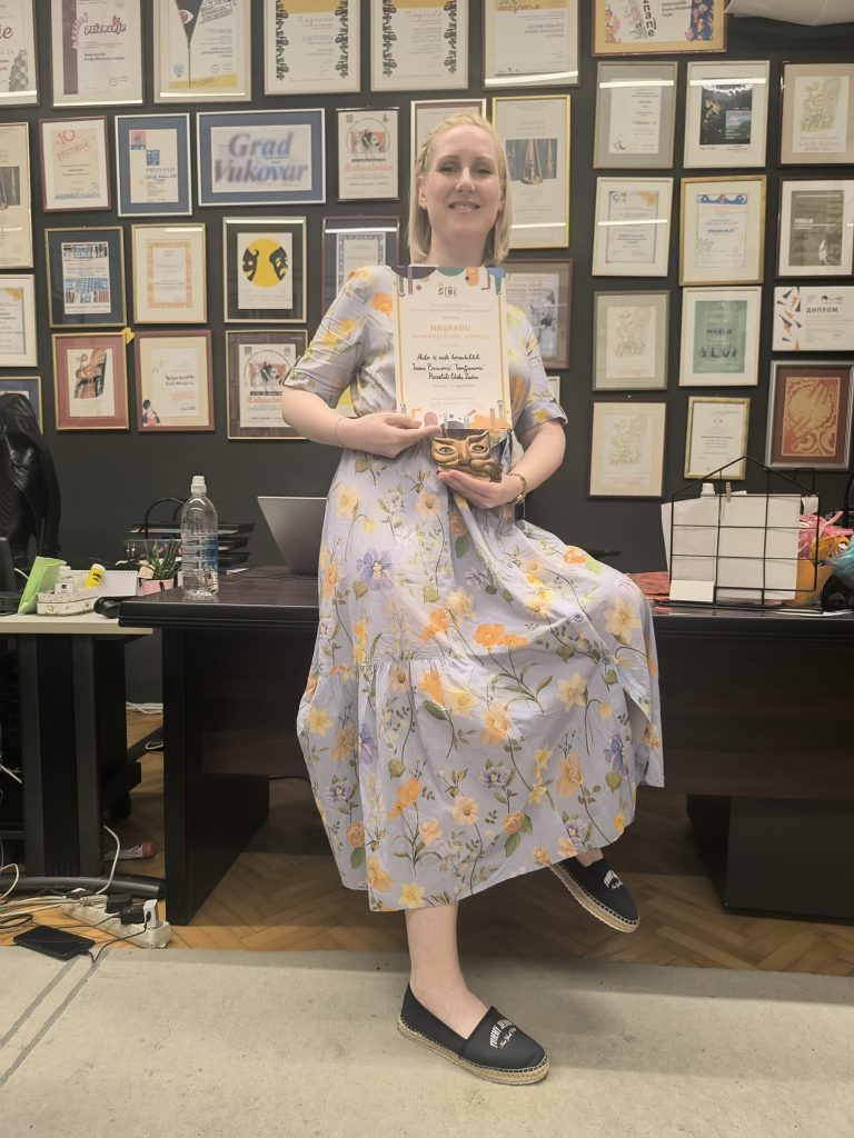 Ona je osoba koja pomiruje smirenu i zrelu komunikaciju i jednu specifičnu scensku zaigranost koju voli i publika i kritika. Otvorena je i nema teme o kojoj neće imati stav, a mene je posebno zanimalo kako je to raditi u zadarskom Kazalištu lutaka okružena ponajviše ženskom energijom, kako je protekao rad na ulozi Majke koja je osvojila žiri, te što sve donosi rad s djecom u kazalištu.