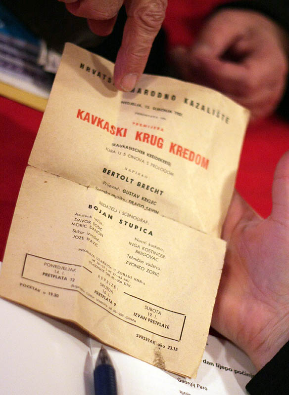 Evo već 51 godinu. Ta prva predstava je bila u režiji Bojana Stupice, i to komad ‘Kavkaski krug kredom’ Bertolda Brechta. Čak kod sebe imam originalni program te predstave iz 1957. godine. Tada sam igrao ulogu prvoga prosjaka. Spomenut ću kako sam prije nekih mjesec dana opet igrao prvog prosjaka i to u Dolenčićevoj ‘Operi za tri groša’ isto od Brechta. Iz toga bi se onda dalo zaključiti kako je moj krug ‘od prvog prosjaka do prvog prosjaka’, što bi se reklo – ‘di pao tu stao’.