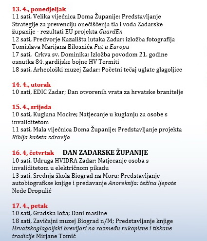 I ovaj tjedan nastavit će se brojna događanja u sklopu obilježavanja Dana Zadarske županije 2015. U četvrtak nas očekuje i svečana sjednica Županije u Arsenalu na kojoj će biti dodjeljene nagrade i priznanja Zadarske županije.