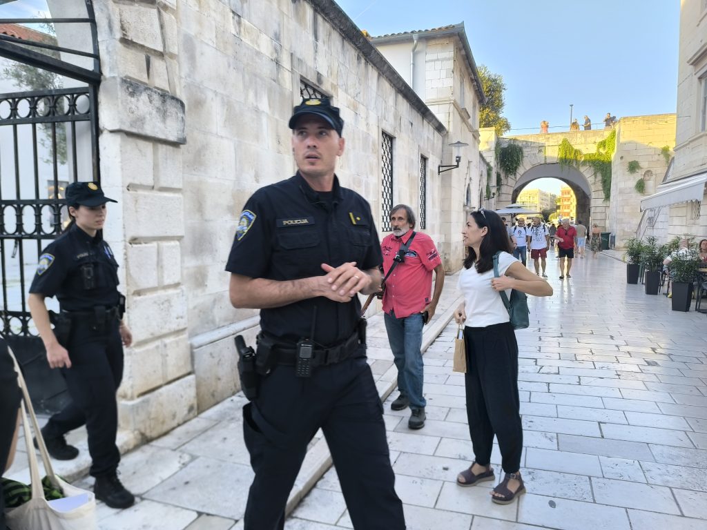 Povorka se zatim uputila prema Međunarodnom centru za podvodnu arheologiju s obzirom da je upravo tamo u 20 sati započelo okupljanje sudionika prvog dana Infobip Shift konferencije. Prosvjednici su uz antiratne pjesme i povike dočekali početak druženja Infobipovca koji su se uz temeljitu provjeru i osgiuranje uspjeli okupiti u ograđenom dvorišnom prostoru obnovljenog kompleksa sv. Nikole.