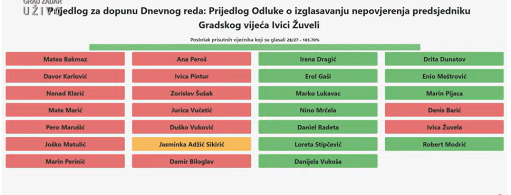 Glasovanje je prošlo je više manje očekivano – HDZ, Biloglav, Barić i Žuvela glasovali su protiv nepovjerenja, a SDP s Enijevim vijećnicima i Robertom Modrićem glasao je za. Jasminka Adžić Sikirić u klubu s Biloglavom ostala je suzdržana.