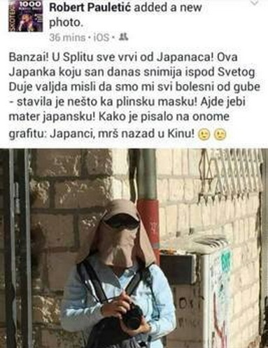 “U Splitu sve vrvi od Japanaca! Ova Japanka koju san danas snimija ispod Svetog Duje valjda misli da smo mi svi bolesni od gube – stavila je nešto ka plinsku masku! Ajde j… m… japansku! Kako je pisalo na onome grafitu: Japanci, m’rš nazad u Kinu!”, napisao je prošlog ljeta Pauletić.