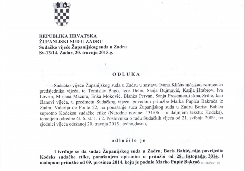 Sudačko vijeće Županijskog suda u Zadru u sastavu Ivana Klišmanić, Tomislav Bago, Igor Delin,Sanja Dujmović,Katija Hrabrov,Iva Lovrin,Mirjana Macura,Enka Moković,Blanka Pervan,Sanja Prosenica i Ana Zrilić na sjednici održanoj 20.travnja.2015 godine jednoglasno je donjelo odluku da Boris Babić nije povrjedio Kodeks sudačke etike.